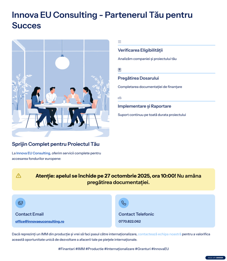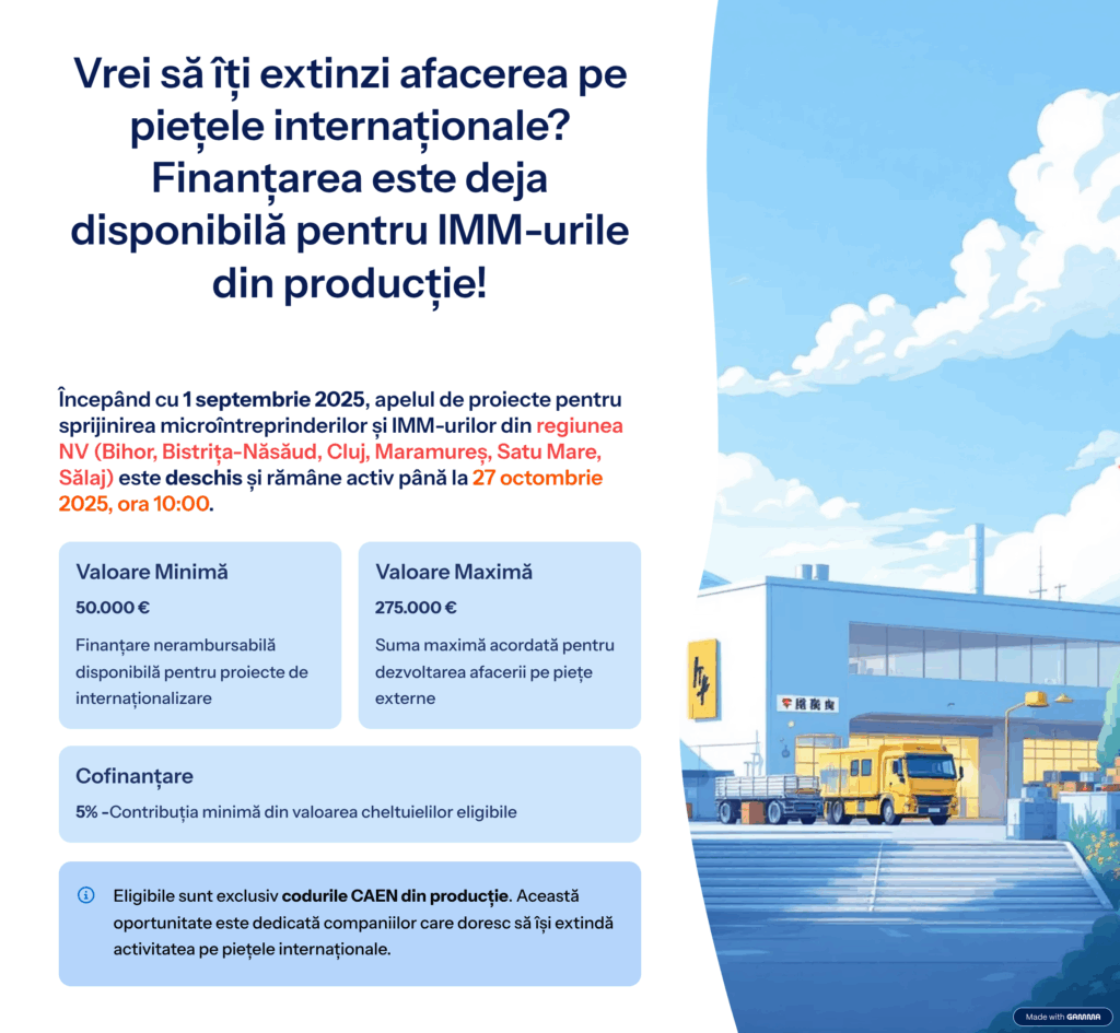 Vrei sa iti extinzi afacerea pe pietele internationale?Finantarea este deja disponibila pentru IMM-urile din productiede adminIMM Etichete:FinantareIMMnerambursabil Lasă un răspuns Anulează răspunsulAdresa ta de email nu va fi publicată. Câmpurile obligatorii sunt marcate cu *Nume * Email * Site web Comentariu * Salvează-mi numele, emailul și site-ul web în acest navigator pentru data viitoare când o să comentez.