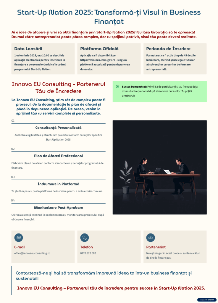 Start Up Nation 2025 Transforma-ti visul in business finantatde adminSTART UP NATION 2025 Etichete:Finantarenerambursabil Lasă un răspuns Anulează răspunsulAdresa ta de email nu va fi publicată. Câmpurile obligatorii sunt marcate cu *Nume * Email * Site web Comentariu * Salvează-mi numele, emailul și site-ul web în acest navigator pentru data viitoare când o să comentez.
